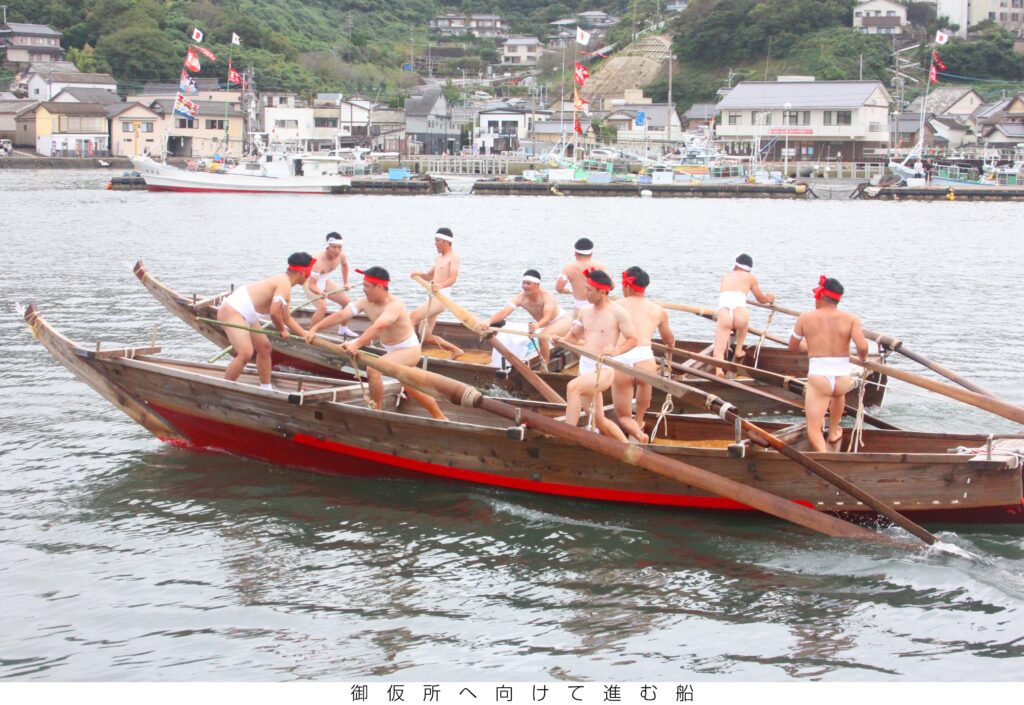 紅白の2隻にそれぞれ鉢巻姿の5人が乗り込み、1人が水竿(みさお)の長い竹を持って漕ぎ手を指揮。同浦郵便局前から対岸の「御仮堂」(おかりどう)までの約250㍍を櫓で漕いだ。