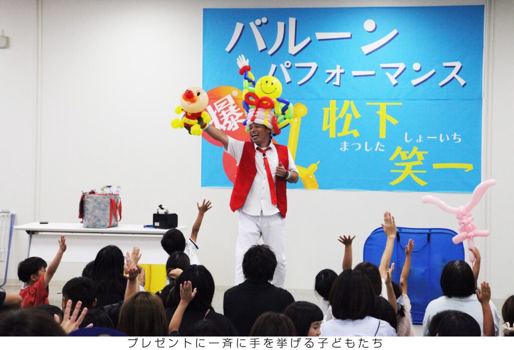 同イベントは、元吉本興業所属で博多大吉の弟子にあたる松下笑一さんのトークと風船アートなどをミックスしたステージで、昨年に続いて2度目の開催。軽妙なトークでお客さんを笑わせながら、テディベアや花束、ウサギ、ハチ、ミッキーマウス、トランプ大統領などのバルーンアート作品を次々に披露。「欲しい人!」と声を掛けると、観客は一斉に勢いよく手を挙げ、作品を贈られると子どもたちの笑顔が弾けた。