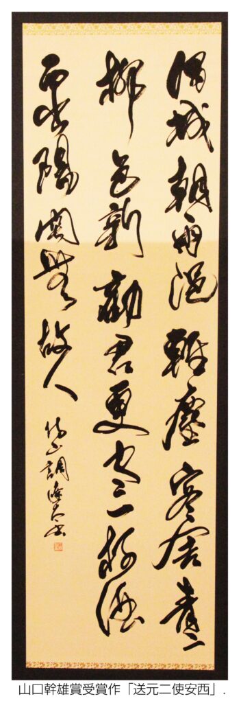 第69回壱岐市美術展(市美術協会主催、1~3日・壱岐の島ホール中ホール)の表彰式が3日に行われた。出品数は絵画16人31点、彫塑・工芸18人26点、書16人21点、写真8人16点の計58人94点。全部門の中から最高賞にあたる「山口幹雄賞」は書の部門に作品「送元二使安西」を出品した勝本町出身の中村遼太さん(26=福岡市在住)が、2018年に続いて2度目の受賞を果たした。山口幹雄賞の複数回受賞は彫塑・工芸の野元敬純さん(16、22年)、絵画の豊坂元子さん(19、24年)に続いて3人目となった。入賞作品などは特別展として来年1月16日から2月8日まで、一支国博物館多目的交流室(3階)で展示される。