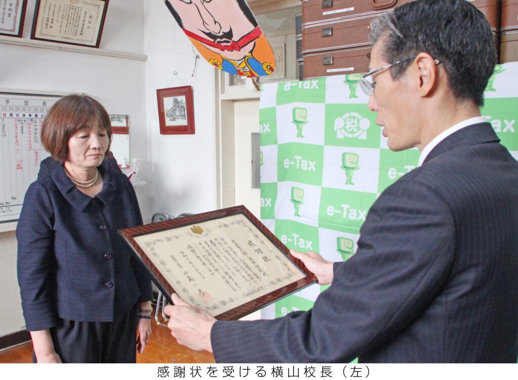 13日、同校で表彰式があり、小澤研也福岡国税局長が横山校長に感謝状を贈った。横山校長は「今後も普段から社会に目を向け、いろいろなものを体験しながら感性を磨き、運動や文化的なもの、または人権など、気づいて素直に表現できる子どもたちに育てていきたい」と話した。