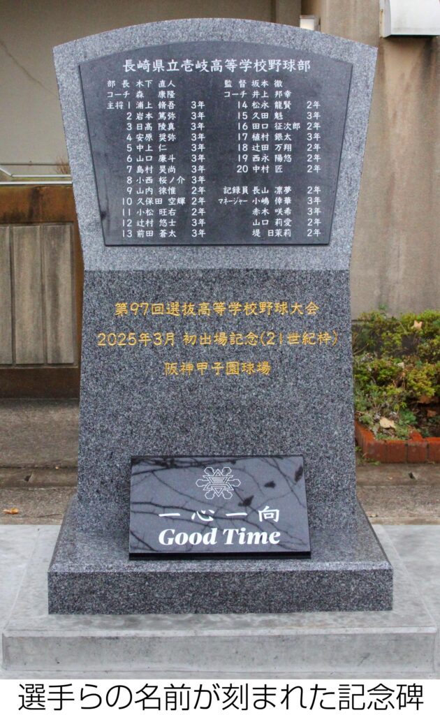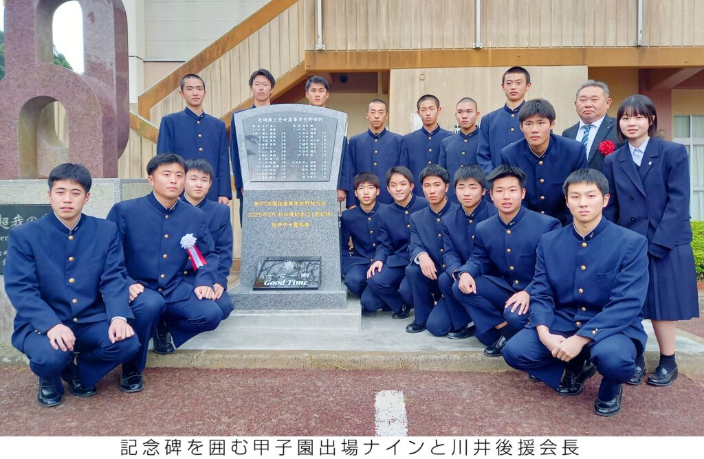 壱岐高校野球部特別後援会(川井智睦会長)は、3月の選抜高校野球大会出場を記念して、同校に記念碑を寄贈した。11日、除幕式を開き、出場選手や保護者、生徒が出席した。