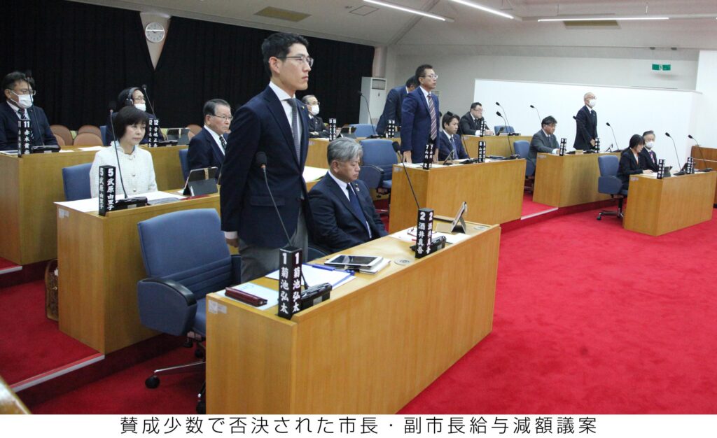 市会計年度任用職員による公金私的流用の発覚に伴い、市長、副市長の給料を1か月間、10分の1削減する特例に関する条例案は、採決の結果、反対11、賛成4で否決された。議員からは「減給で幕引きでは再発防止につながらない」「公表基準を見直し、処分の厳格化を求める」などの反対意見があった。