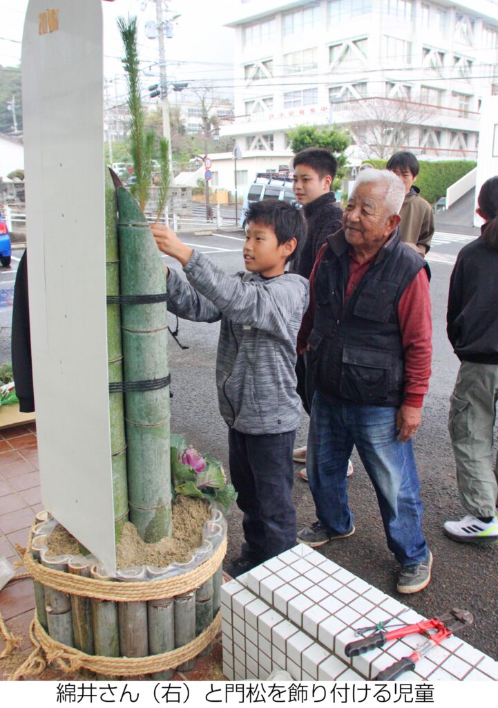 2. 「楽しい年に」児童と門松製作 元地域防犯リーダーの綿井さん