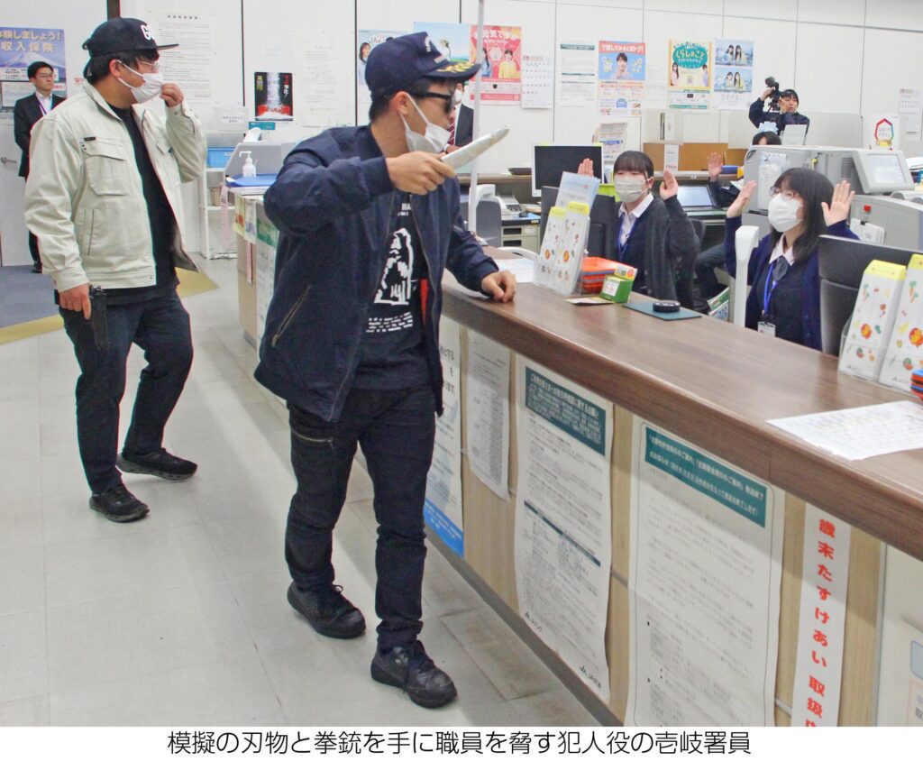 訓練では、ナイフと拳銃を持った壱岐署員扮する強盗犯2人がカウンターの職員に「金を出せ」「通報したら家族も道連れだ」と脅して現金を強奪し、車両で逃走。通報を受けて駆け付けた警察官に犯人の特徴など伝えた。