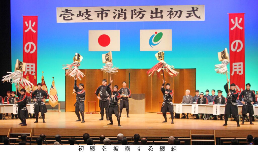 令和8年壱岐市消防出初式が6日、壱岐の島ホールであり、団員ら関係者約5百人が出席。芦辺地区消防団の纏組が「初纏」を披露して一年の防火と安全を祈願した。