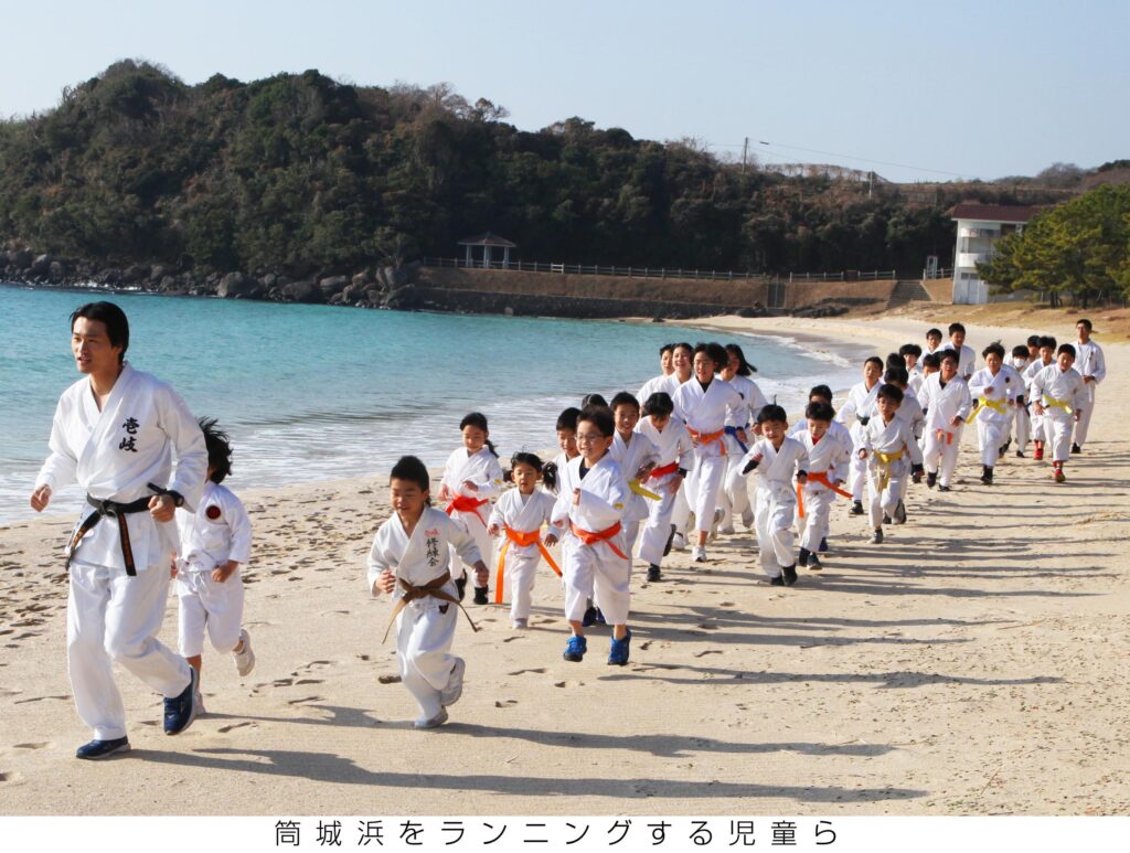 30年以上続けられている恒例行事で、参加者は道着姿で筒城浜でランニングと海へ向かって突きや蹴りなどの基本稽古を行い、心身を清めた。体育館では形の稽古を行い、汗を流した。