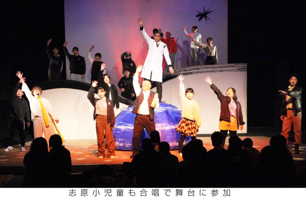 21日志原小の公演では、5、6年生12人が合唱などに参加し、全校児童が鑑賞。立花秀史校長は酔っぱらいの「呑み助」、山内隆一教頭は地理学者役で熱演を見せた。舞台終了後は児童全員が役者たちにサインをもらうために長い列を作った。
