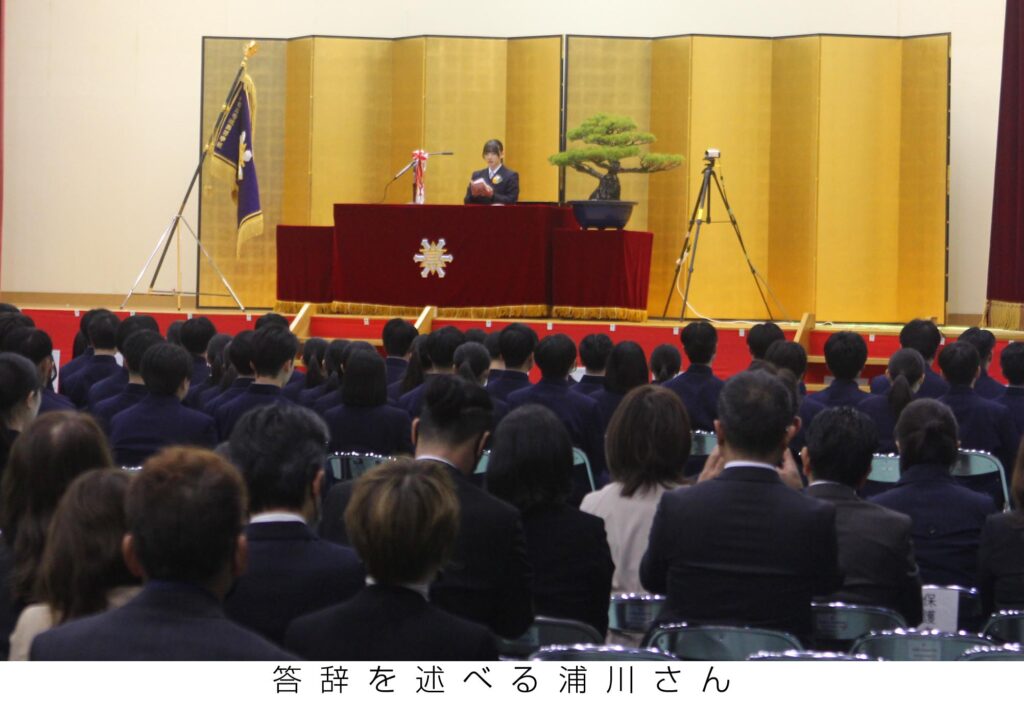 卒業生代表の答辞では、浦川寧琉さんが修学旅行や甲子園での応援など高校生活を振り返り、先生、親友、両親への感謝の言葉を述べ「これから思い通りにいかないこともたくさんあるでしょう。どんな壁も仲間と乗り越えてきた楽しかった毎日を思い出して進み続けましょう」と述べた。