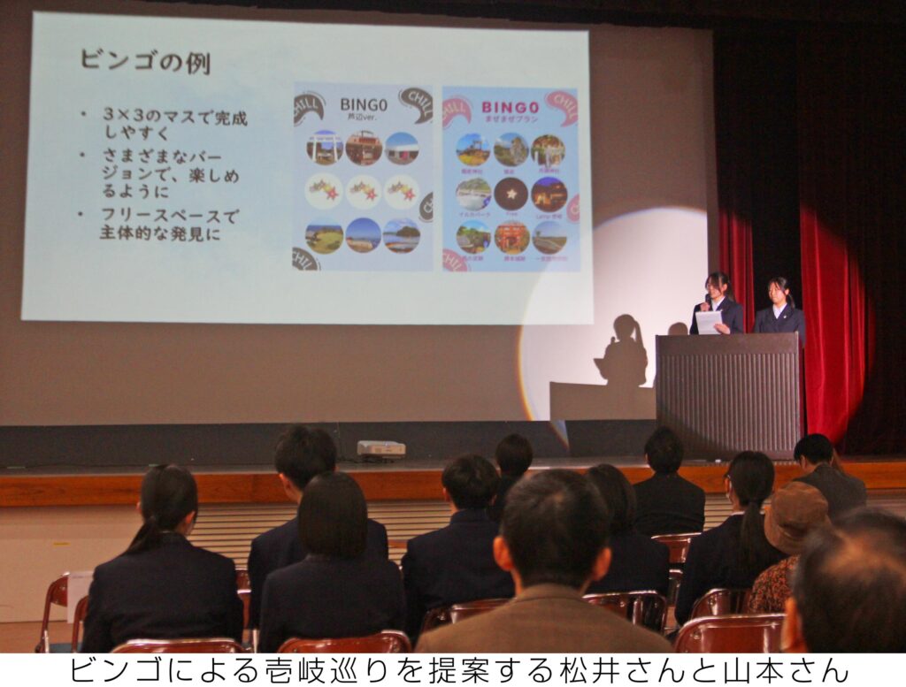 発表を終え、松井さんは「ビンゴの目的地だけでなく、行く過程で見た壱岐の地域の風景も楽しめた。観光地だけでなく、壱岐の知らないところも楽しむことができた」、山本さんは「普段は車で通るだけだけど、実際に歩き色々な景色があることに気づけてよかった」と話した。
