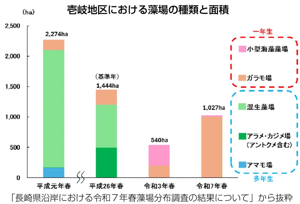 藻場はアラメ・カジメ、アマモを主体とした多年草海藻の「四季藻場」とワカメやガラモ場など一年海藻の「春藻場」に分類されるが、令和3年以降、四季藻場が減少し、春藻場が拡大している。