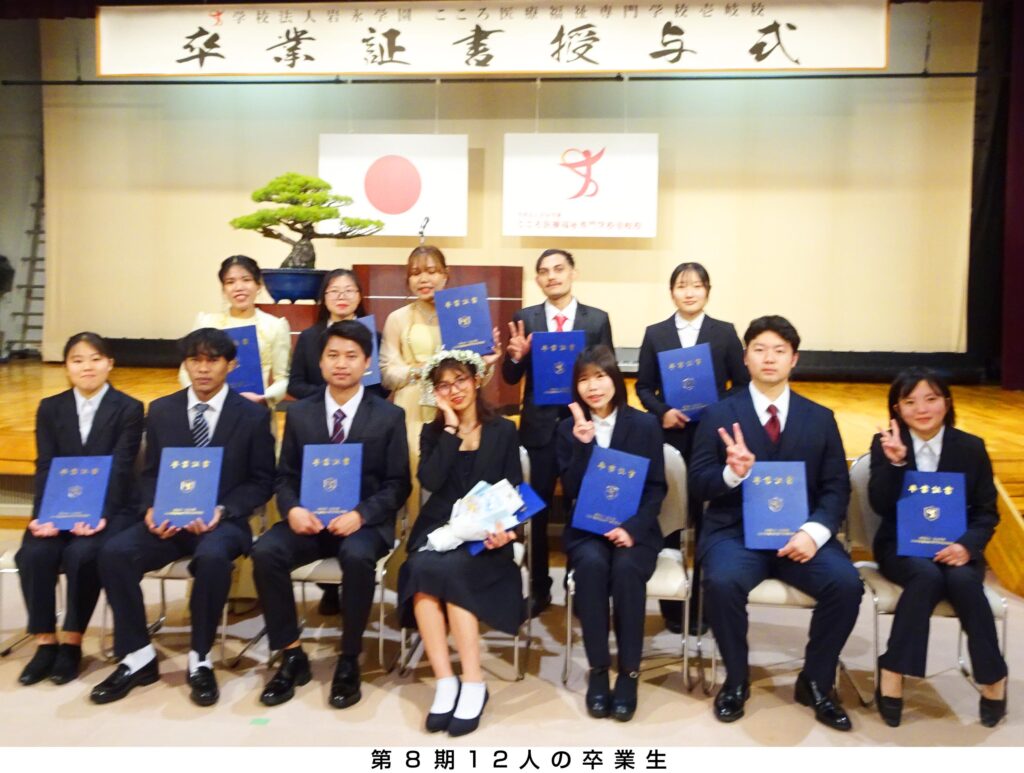 学校法人岩永学園・こころ医療福祉専門学校壱岐校(後藤久志校長)の第8回卒業証書授与式が5日、芦辺町、クオリティライフセンターつばさで開かれ、介護福祉科の第8期生12人(日本人5人、留学生7人=ミャンマー5、ネパール1、中国1人)が卒業した。