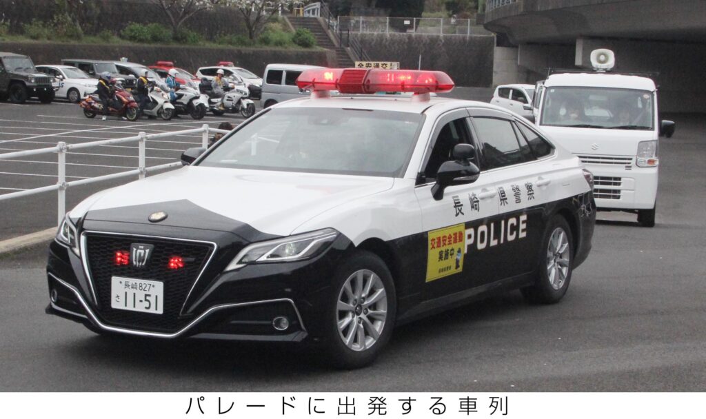 パレードには壱岐署や幼児交通安全クラブなど関係11機関から約30人が参加。壱岐の島ホールで開いた出発式で、平山和寛壱岐署長は「1月に70代女性が亡くなる死亡事故が発生し、11年連続で発生している厳しい状況。昨年は登校中の小学生が横断歩道を横断中に大けがを負う事故が起きたほか、横断歩道を利用中の事故が4件発生している。子どもを含めた歩行者保護の機運を高めていただきたい」とあいさつした。