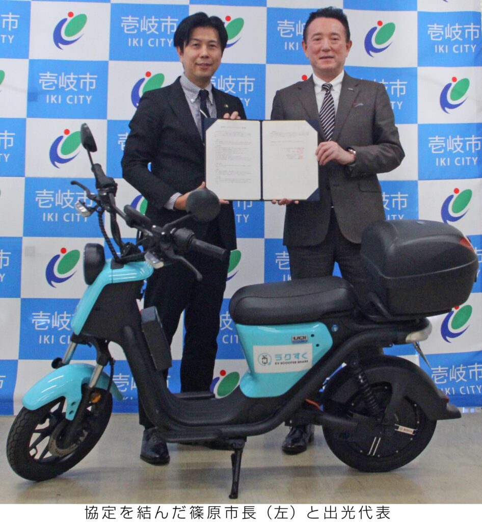 株式会社新出光(出光泰典代表取締役、本社・福岡市)は8日、壱岐市とエンゲージメントパートナー協定を締結した。同社は昨年9月から3か月間、電動バイクのシェア事業「ラクすく」の実証実験を本市で行っており、今月からも1年間継続する。協定は61件目。