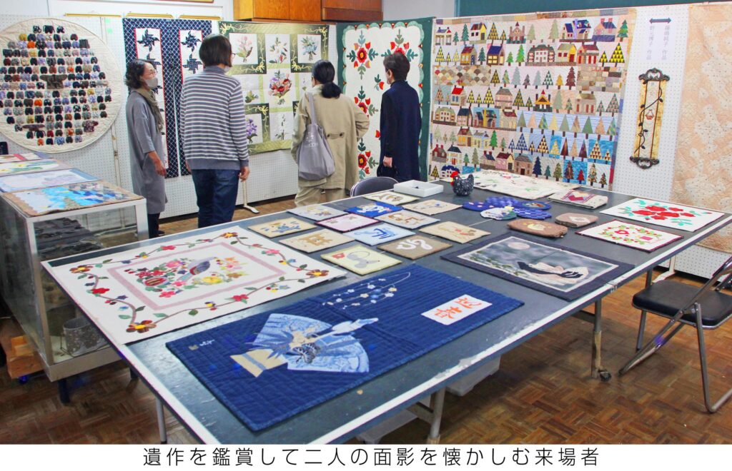 遺作展にはパッチワークで作られたキルトやバッグ、モラなど二人の作品約150点を展示。家族や当時を知るサークル仲間が訪れ、面影を懐かしんだ。