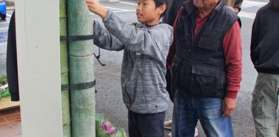 「楽しい年に」児童と門松製作 元地域防犯リーダーの綿井さん